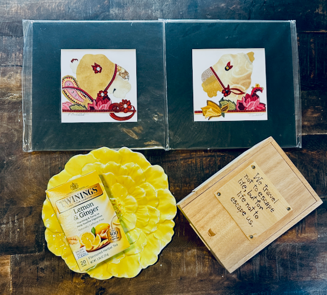 This curated tea and travel set combines thoughtful artisan pieces with a classic blend to inspire your next quiet moment or grand adventure. Item Details: Whimsical Art Duo: Two coordinated, colorful sketches in deep green mats featuring intricate patterns and delicate detailing. Yellow Petal Plate: A vibrant, sun-drenched ceramic plate shaped like a blooming flower, perfect for serving treats alongside your brew. Twinings Lemon & Ginger Herbal Tea: A box of 20 individually wrapped tea bags. This naturally caffeine-free blend features zesty lemon and warming ginger to soothe digestion. Inspirational Keepsake Box: A handcrafted wooden keepsake box featuring a hand engraved travel quote: "We travel not to escape life, but for life not to escape us". Experience the Journey This set is designed for those who appreciate the beauty in the everyday. Use the vibrant plate for your favorite biscuits, steep a comforting cup of lemon and ginger, and let the inspirational wooden box hold your most cherished travel memories.