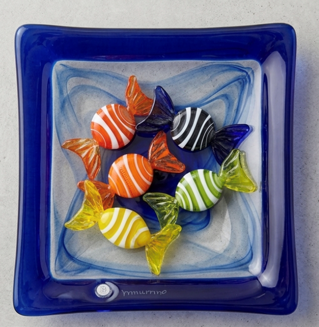 This refined set from The Murrino Collection showcases the pinnacle of Venetian artistry, featuring the complex techniques that have made Murano glass world-renowned. Item Details: Signature Murrino Glass Tray: An exquisite flat square plate handcrafted in Murano, Italy. This piece features a crystal-clear body and a striking cobalt blue rim, showcasing the purity and brilliance of authentic Vetro Artistico Murano. Artisan "Millefiori" Candies: A collection of approximately 15 hand-blown glass candies. Each "sweet" is individually crafted using murrine rods cut into small pieces and fused to create intricate flower-like "millefiori" patterns. A Legacy of Craftsmanship The term "murrine" refers to the intricate mosaic-style patterns revealed when layered glass canes are sliced. This set is a true collector's item, often called "forbidden candy" for its tempting, realistic appearance. Each piece comes with a certificate of authenticity, guaranteeing its origin from the historic furnaces of Venice.